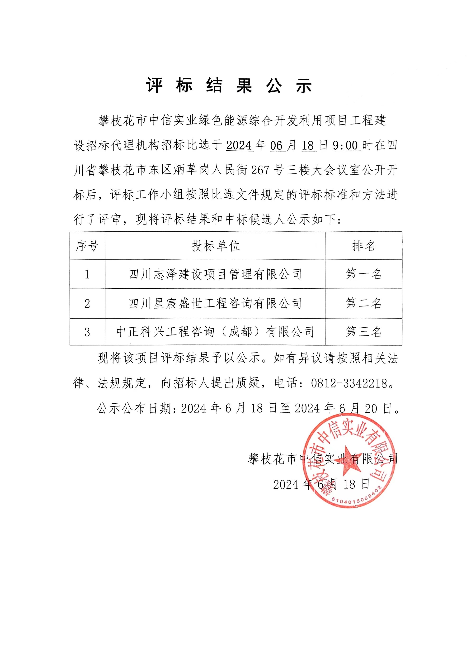攀枝花市中信實業(yè)有限公司綠色能源綜合開發(fā)利用項目工程建設招標代理機構招標比選評標結果公示